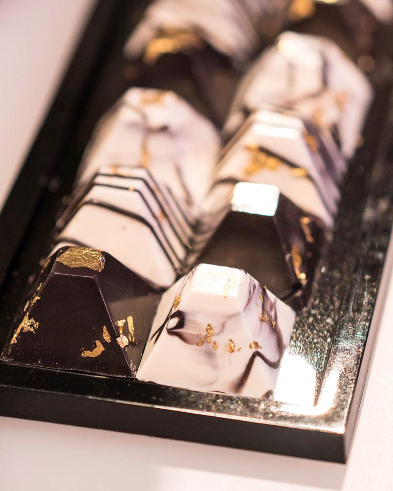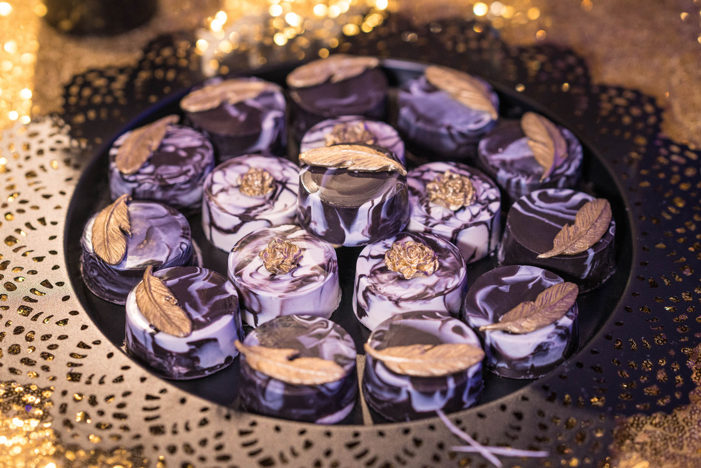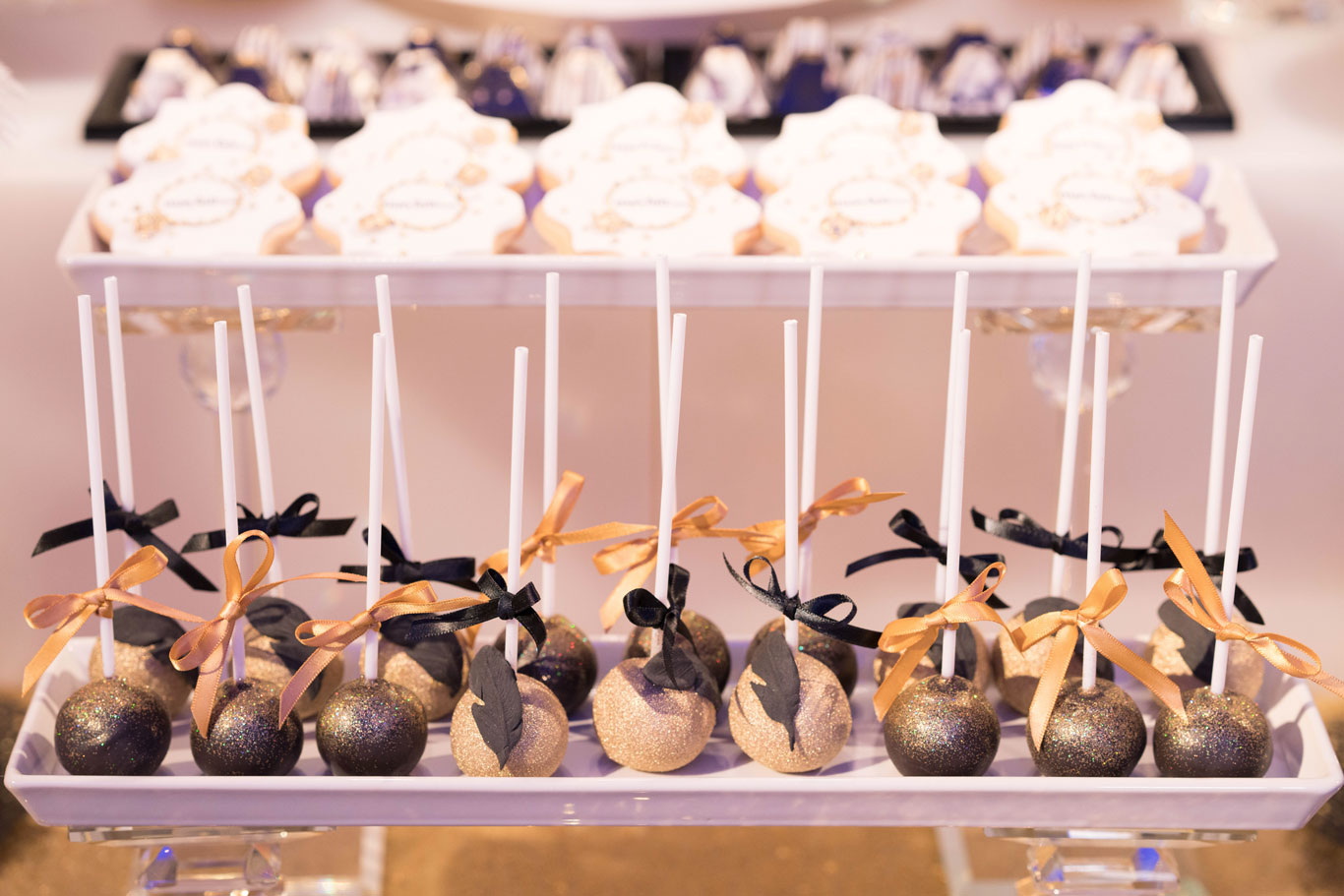 The Indulgence Bar was complemented with the addition of alternate black, gold and white cake pops which were generously covered in chocolate and adorned with sugar crystals, before being tied with a delicate bow ribbon. Featuring a rich chocolate and vanilla flavour.