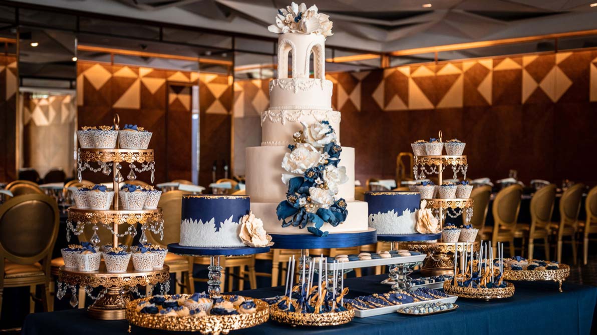Our decadent cupcake tower and one of our single tier wedding cakes with delicate gold marble cracking.